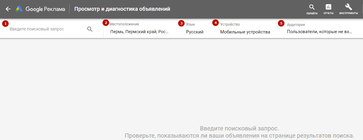 Есть более разумный способ проверить, показывается ли реклама и на какой позиции – инструмент просмотра и диагностики объявлений. Он позволяет посмотреть реальные результаты поиска Google и узнать: