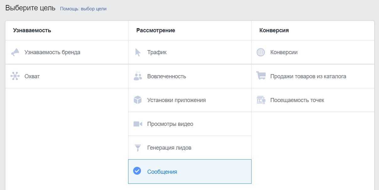 Чтобы создать объявления с переходом в кампанию WhatsApp, выбираем цель «Сообщения».
