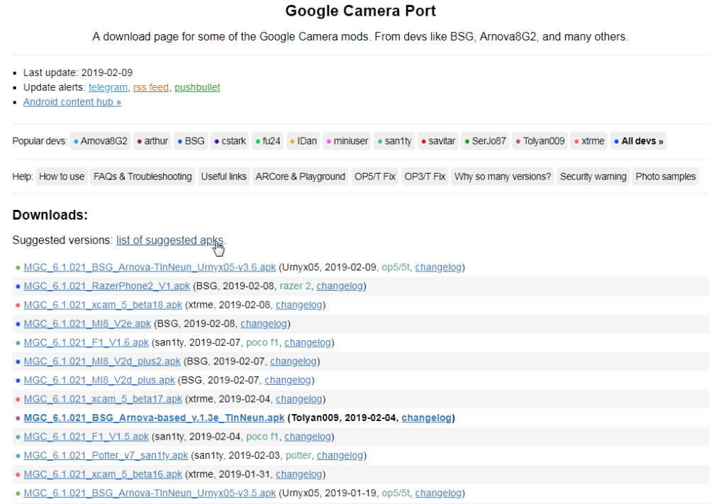 На ресурсе Celsoazevedo собраны все порты Google Camera Port. Установочные файлы .apk отсортированы по дате выхода. Каждый файл содержит список изменений (changelog), номер сборки и дату релиза.