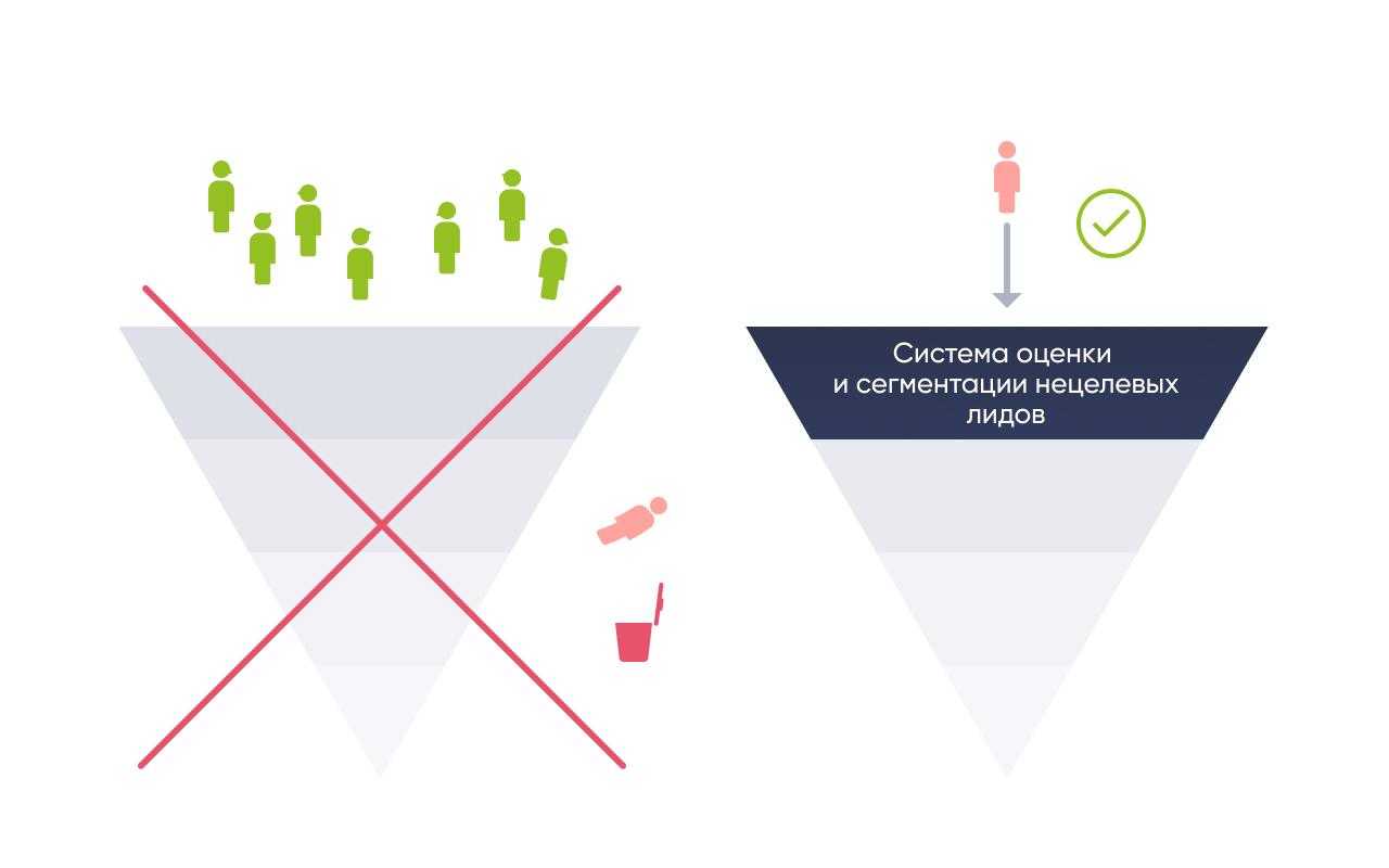 В большинстве случаев в CRM заводятся текущие клиенты и наиболее горячие потенциальные. Все остальные заявки в лучшем случае валидируются как некачественные лиды, в худшем — никак не учитываются и пролетают мимо воронки. Таким образом мы теряем потенциального клиента в самом начале пути. Для повышения продаж «некачественные» лиды тоже необходимо классифицировать, обрабатывать и далее принимать соответствующие решения, стоит ли, например, расширять спектр услуг для данных клиентов.
