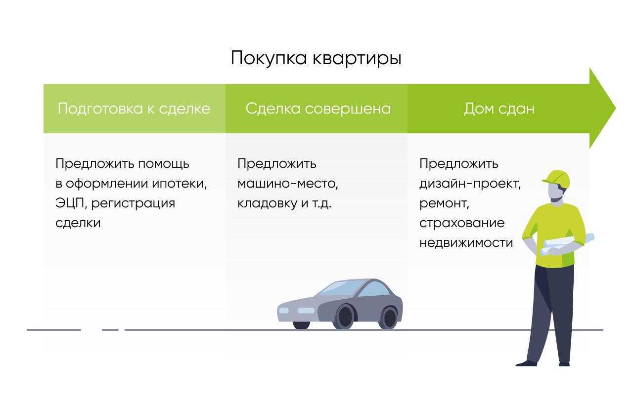 Правильный путь: не забывать о клиентах сразу после покупки, а закольцевать воронку, настроив автоматический апсейл по определённым аудиторным сегментам. Например, в сфере продажи новостроек после совершения сделки можно в разные промежутки времени предлагать машиноместо, кладовку, дизайн-проект и другие услуги.