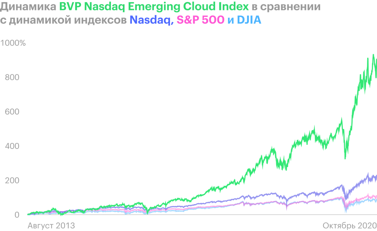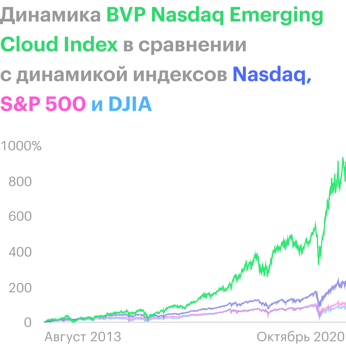 Так, индекс BVP Nasdaq Emerging Cloud — отслеживает 54 облачные компании, которые публично торгуются, — вырос на 920% с 2011 года. Это превосходит динамику роста Nasdaq в четыре раза, а динамику S&P 500 и DJIA — в 8 и 10 раз соответственно.