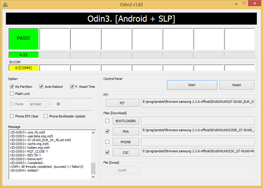 8. в Odin нажимаем кнопку Start и ждем, пока все файлы будут обновлены.