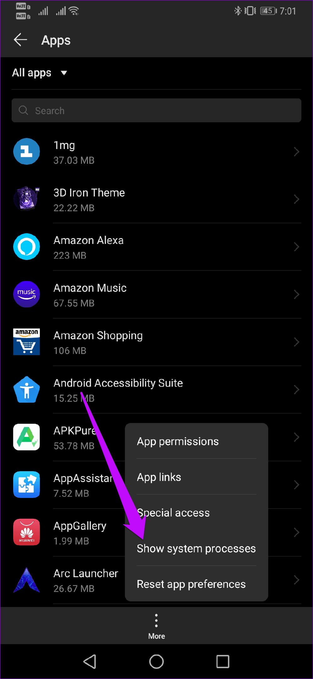 Чтобы очистить его, откройте «Настройки» и перейдите в «Приложения». Нажмите на меню из трех точек и выберите Система (или Показать системные процессы).