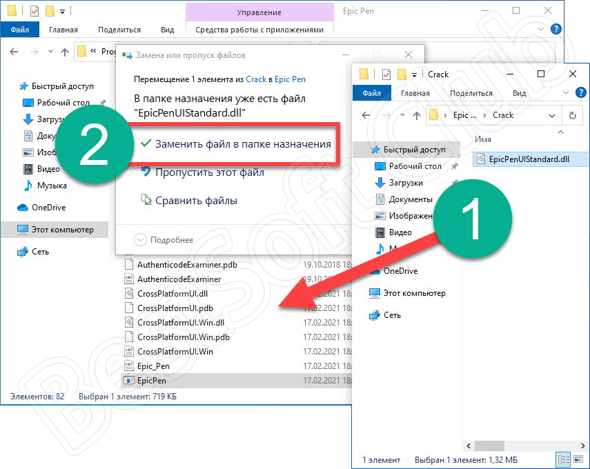 - Перед тем как начать работать с программой, мы должны также активировать ее. Копируем в буфер обмена файл из папки кряка и, перейдя как в каталог установки программы, вставляем его. В результате появляется предупреждение о необходимости замены. Соглашаемся.
