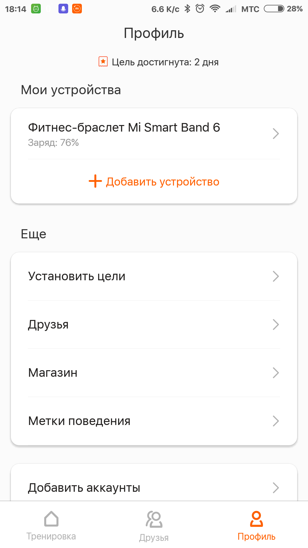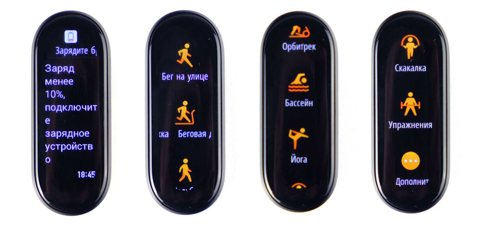 - Увеличено количество режимов для автоматического определения и отслеживания. В Mi Band 5 были доступны только два режима — ходьба и бег, а в Mi Band 6 добавлены еще несколько видов — орбитрек, велосипед, гребной тренажер.
