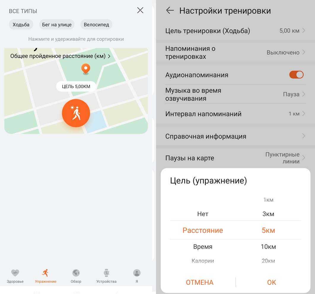 Имейте в виду, что при запуске уличных тренировок с телефона, а не браслета, вам нужно тоже задавать цель и аудионапоминания, так как эти настройки на телефоне и браслете автономны друг от друга. Кстати, завершать тренировку можно долгим нажатием боковой кнопки фитнес-браслета, пока вокруг квадрата не прорисуется полная окружность и браслет не издаст вибрацию.