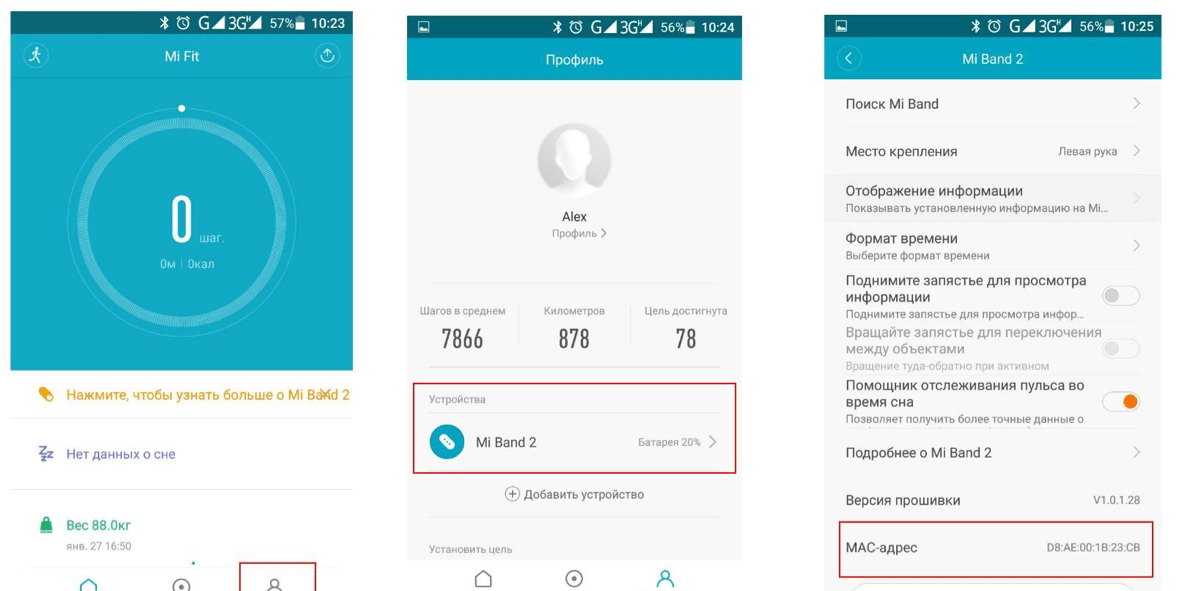 - Умные «злоумышленники» научили свои поддельные браслеты подключаться к Mi Fit, что, как говорилось выше, автоматически указывает на оригинал, но проверить этот пункт достаточно просто. Необходимо зайти в приложение, подключить устройство и пройти в меню Профиль – Mi Band – MAC-адрес. В случае с первой версией браслета задавалось значение 88:0F:10, а для второй придумали систему случайного генерирования MAC-адреса. Естественно, если при нескольких подключениях устанавливается одно и то же значение, то вывод напрашивается сам собой.