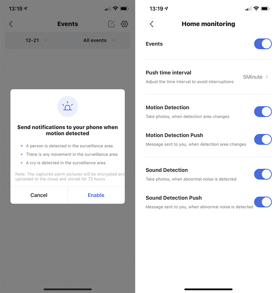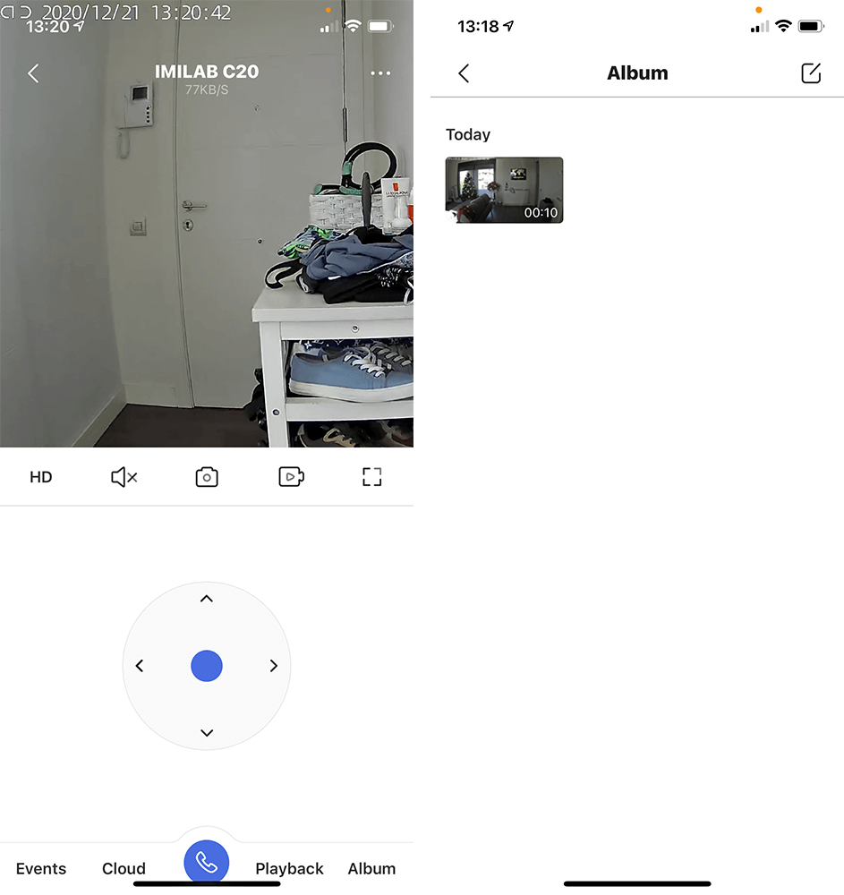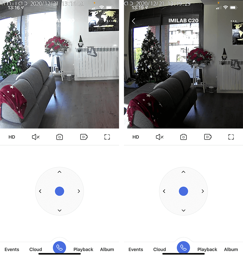 Распознавание движения есть, но в IMILAB C20 также добавилась функция распознавания детского плача, поэтому камеру можно использовать как видеоняню. Распознает даже малейшие движения, присылает об этом push-уведомление и автоматически начинает запись, чтобы запомнить «нарушителя». У моей прошлой камеры тоже такое есть, но у C20 распознавание срабатывает лучше. Например, она не реагирует на малейшее изменение света в комнате, так что ложных срабатываний меньше.