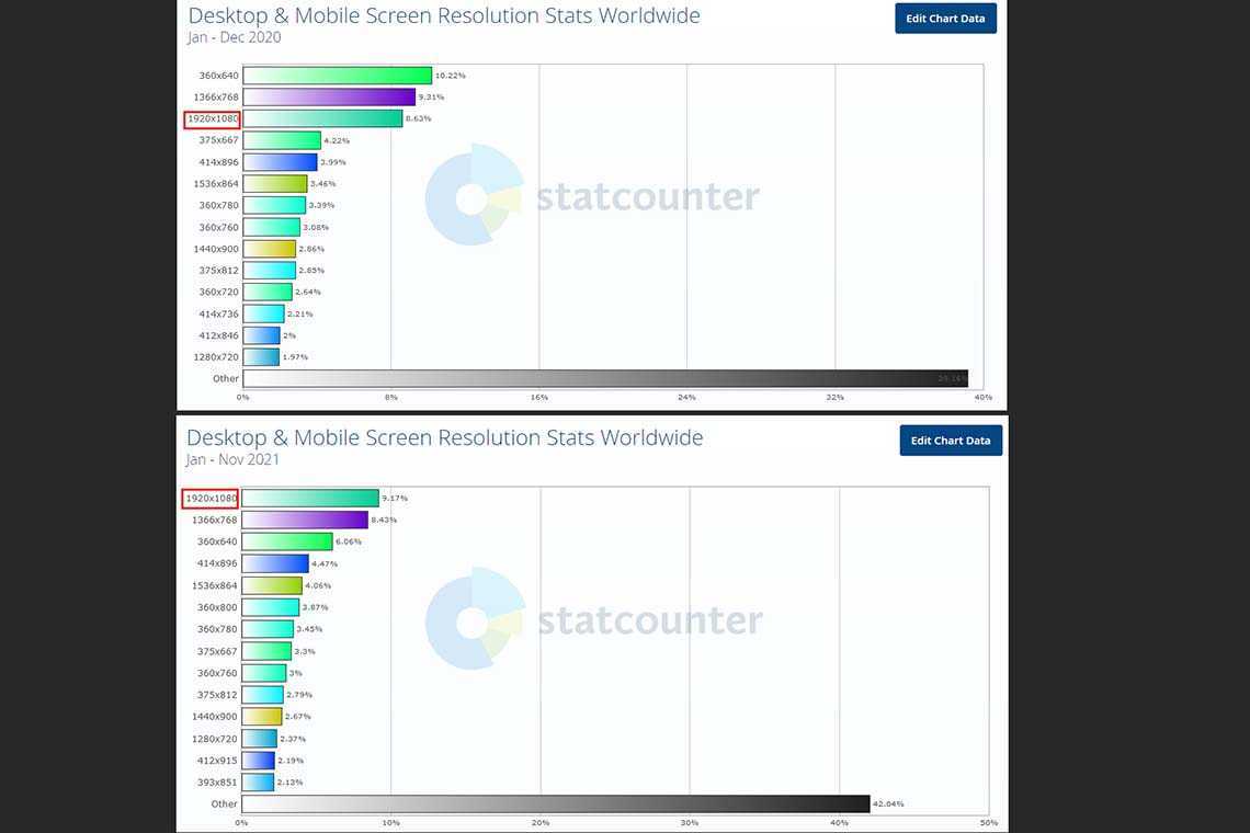 По сравнению с 2020 годом, максимальное разрешение экранов в топе постепенно растёт. Например, в общей статистике разрешение 1920х1080 поднялось с третьей строчки на первую, а 1280х720 отыграло целых две позиции!