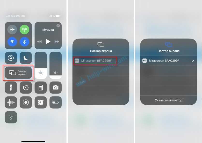 На Айфоне или Айпаде открываем центр управления и выбираем «Повтор экрана». Если все подключили правильно, то в списке доступных устройств должна отображаться наша MiraScreen приставка. Просто выбираем ее.