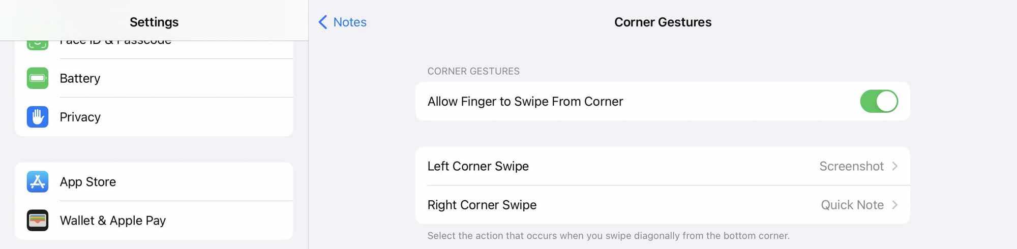 В настройках приложения Notes появляется та же панель «Угловые жесты», которая обычно находится в «Настройки» → «Основные» → «Жесты». Именно здесь вы можете переключать угловые жесты iPadOS, которые позволяют вам вызывать снимок экрана или быструю заметку, проводя по диагонали от нижнего левого или правого угла экрана.