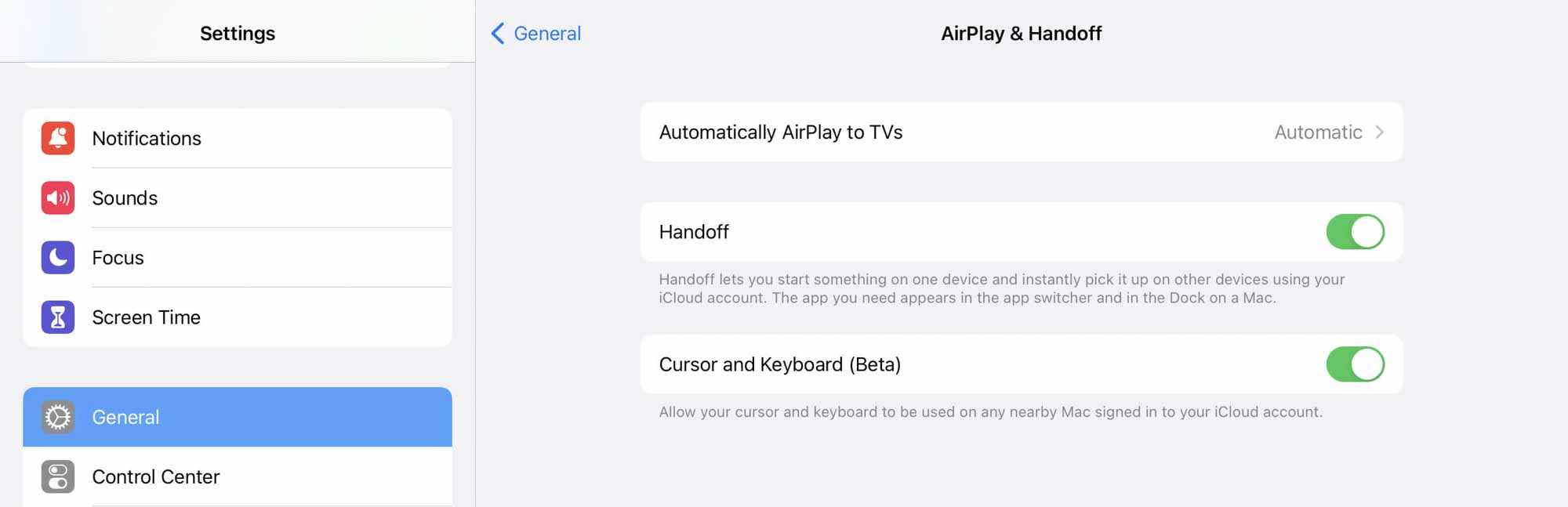 Наконец, что не менее важно, есть универсальное управление, которое можно включить через «Настройки» → «Основные» → «AirPlay & Handoff». В бета-версии iPadOS 15.4 Apple называет Universal Control курсором и клавиатурой (бета-версия)