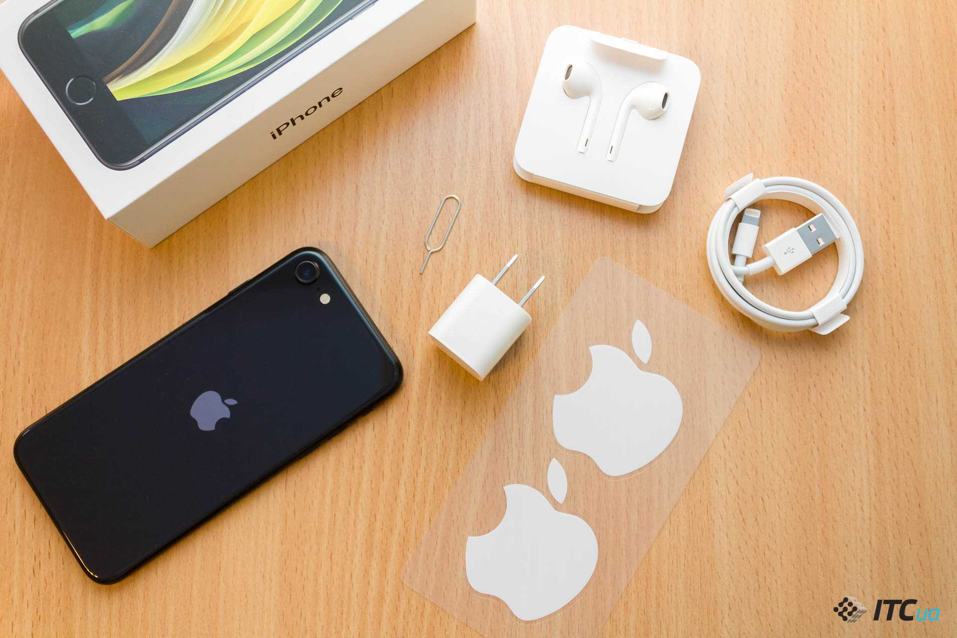 В хорошо знакомой коробке находится такой же iPhone 8, как раньше, еще и с таким же комплектом, из которого, правда, пропал переходник для наушников. И если с флагманами казалось несправедливым, что в комплекте нет мощного блока питания или переходника для наушников, то с небольшим ценником модели SE, это уже не кажется чем-то незаконным. Напомню, что обычно в коробке с iPhone есть зарядное устройство, съемный кабель USB-A-to-Lightning, «скрепка», гарнитура (с соответствующим разъемом), наклейки и информационные бумажки.