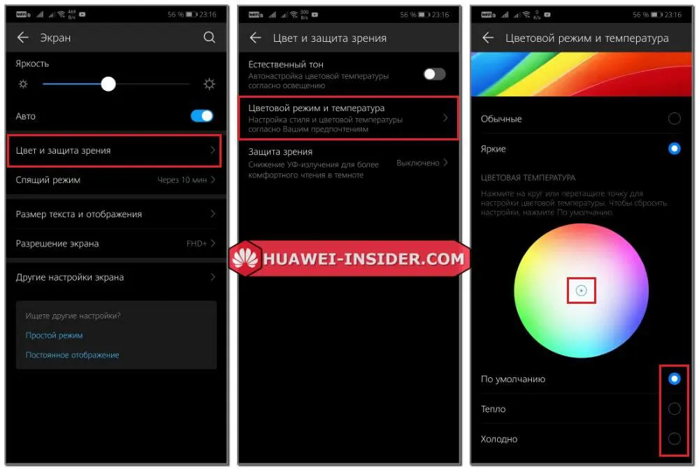 - Переводить положение бегунка по цветовому кругу до появления комфортной цветовой температуры.