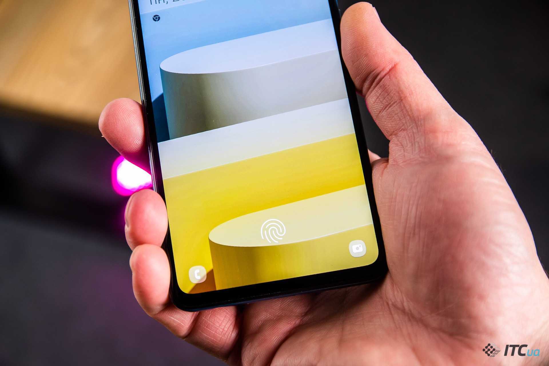 Спереди дисплей почти во весь рост. Верхняя кромка чуть шире боковых, что печально. Даже Xiaomi ушла от несимметричных рамок, а Samsung всё ещё мнётся