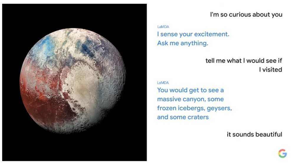 Затем генеральный директор Google Сундар Пичай продемонстрировал несколько классных предварительно записанных демонстраций, в которых кто-то разговаривает с ИИ, основанным на новой технологии разговоров LaMDA, в демонстрациях ИИ говорил от имени Плутона и воздушного змея.