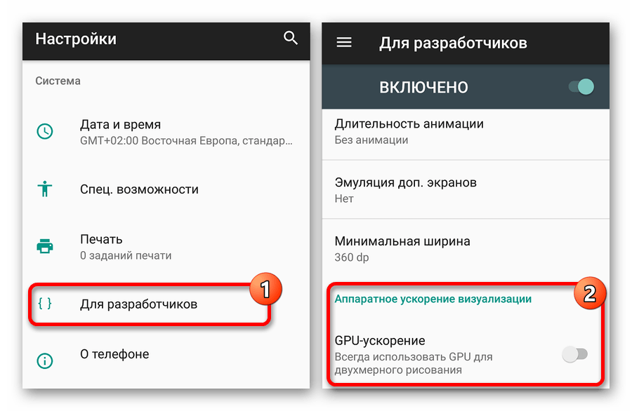 В смартфонах с версией прошивки 4.0 и новее также настоятельно рекомендуется ускорить работу графической подсистемы. Сделать это несложно, достаточно пройти путь: «Настройки» — «Для разработчиков» и напротив пункта «Ускорить работу GPU» или «Ускорении при помощи GPU» поставить галочку.