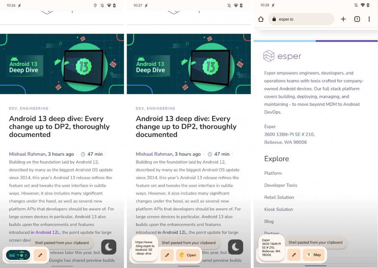 Как можно увидеть на скриншотах выше, когда пользователь копирует текст или изображение, в левом нижнем углу появляется оверлей буфера обмена. Он содержит предварительный просмотр скопированного текста или изображения, а также кнопку редактирования, при нажатии на которую открывается активити «Разметка» (для изображений) или облегченное активити редактирования текста (для текста). Если скопированный текст содержит полезную информацию, которая может быть использована, например, адрес, номер телефона или URL, то также появляется дополнительная кнопка взаимодействия.