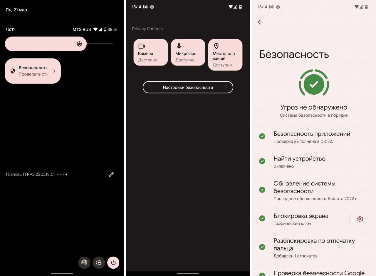 В Android 12 Google представила новые переключатели доступности микрофона и камеры, которые позволяли быстро закрывать доступ приложениям к ним. Теперь Google видимо решила предоставить пользователям использовать объединенную плитку, которая включает в себя и переключатель геолокации. При нажатии на плитку вам открывается полноэкранный интерфейс «Privacy Controls» с тремя прямоугольными кнопками для переключения доступа к камере, микрофону и местоположению. Под ними находится кнопка «Настройки безопасности», которая открывает соответствующий раздел настроек в телефоне. Сам интерфейс выглядит незаконченным, но будем надеяться Google исправит этот момент.