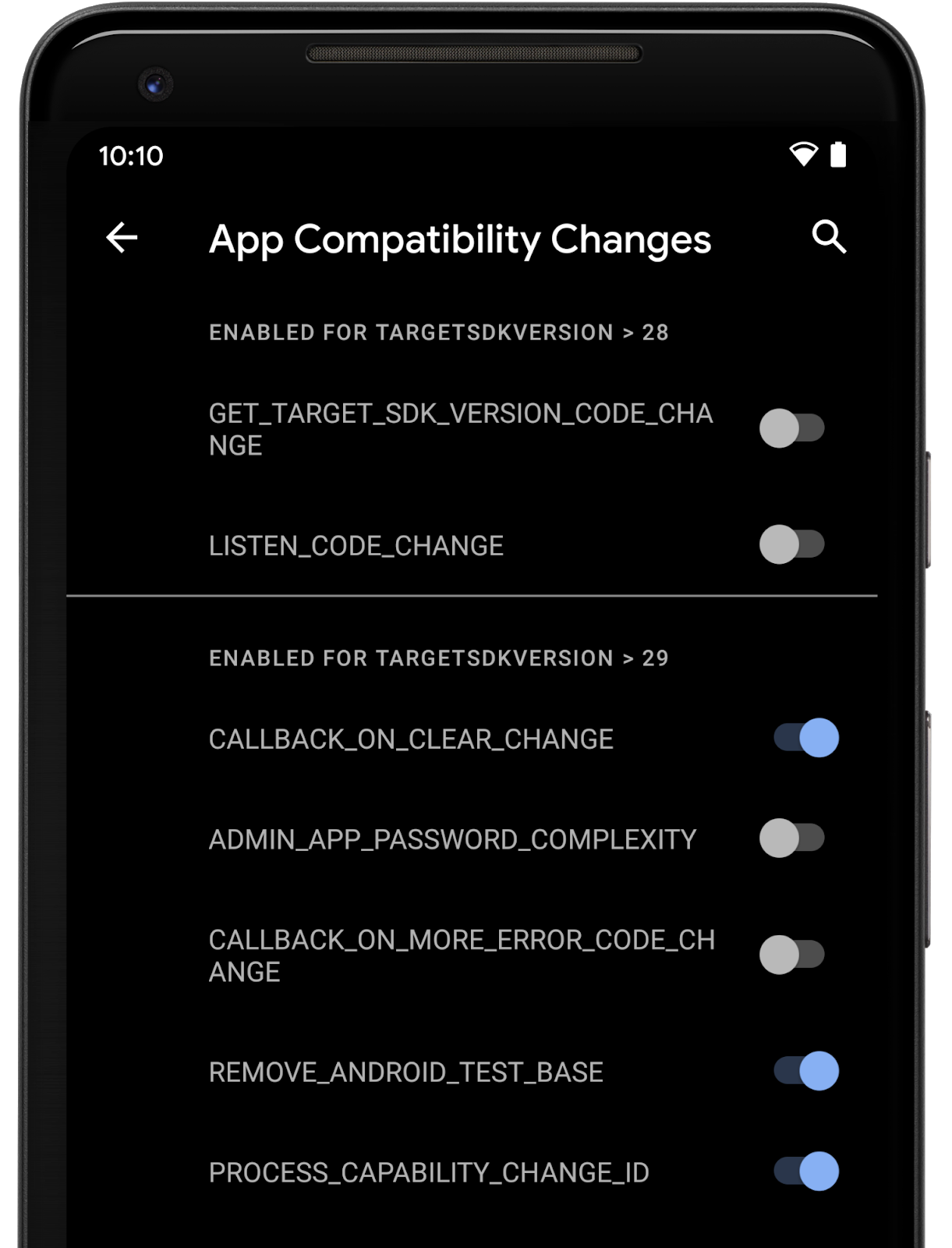 To help you with testing, we’ve made many of the breaking changes toggleable, so you can force-enable or disable them individually from Developer options or adb. Check out the details here. Also see the greylists of restricted non-SDK interfaces, which can also be enabled/disabled.