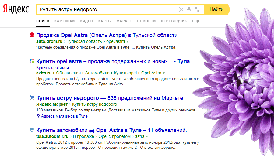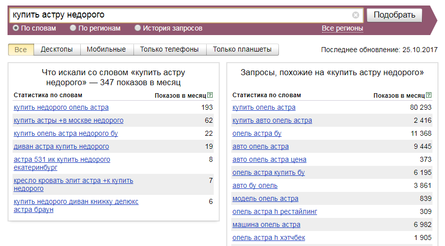 Проверьте, какой смысл пользователи вкладывают в то или иное понятие, с помощью Яндекс.Вордстата. Из примера видно, что по запросу «купить астру недорого» люди в основном ищут автомобили.