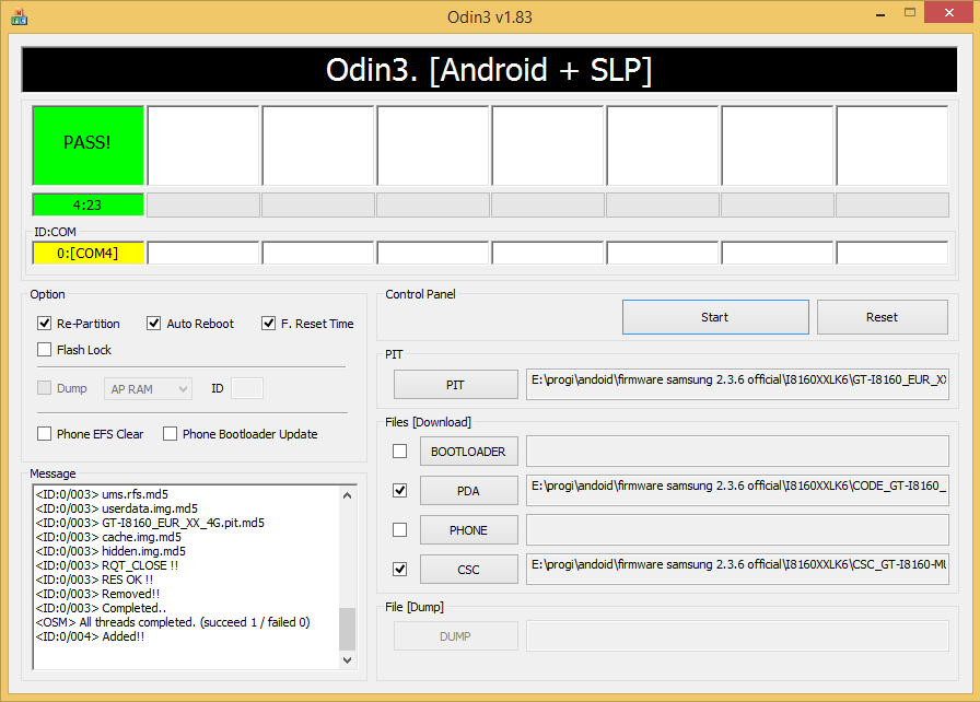- На центральном окне в Odin нужно выбрать загруженные файлы PIT, PDA и CSC.
