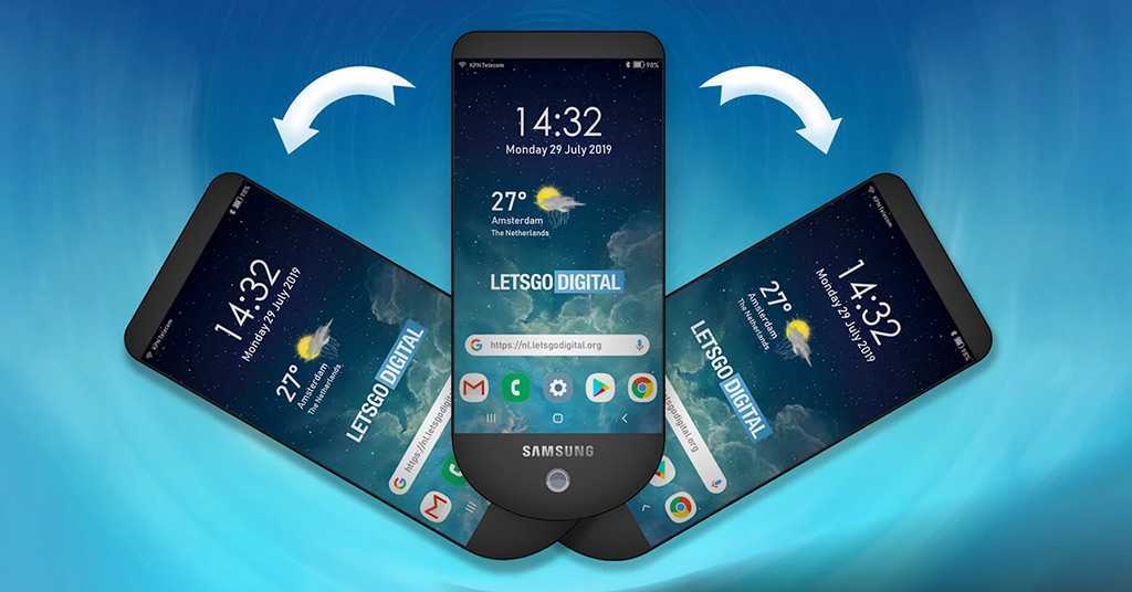 Смартфон с тремя дисплеями. Компания Samsung запатентовала еще один необычный дизайн смартфона — телефон с тремя дисплеями, расположенными друг за другом. Смартфон состоит из трех одинаковых частей, соединенных с помощью металлического стержня, который позволяет вращать дисплеи вправо и влево. При этом на смартфоне не были замечены кнопки или камеры, а задняя панель и вовсе полностью гладкая. На фронтальной панели есть отверстие разговорного динамика. Несмотря на регистрацию патента пока что неизвестно, когда такой гаджет поступит в продажу.