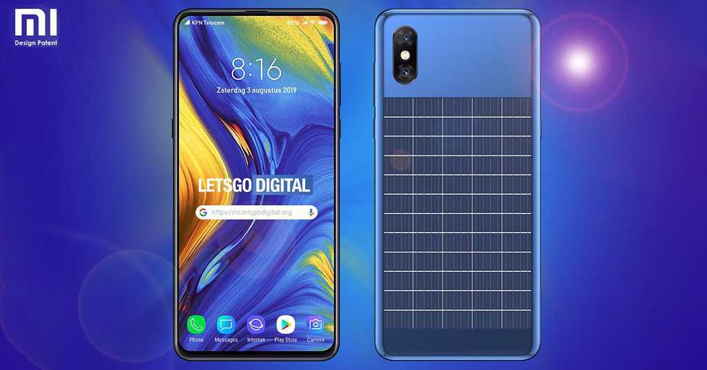 Телефон с солнечной батареей. Китайская компания Xiaomi запатентовала безрамочный смартфон со встроенной солнечной батареей. Устройство размещено в задней части телефона и занимает достаточно большую площадь панели.