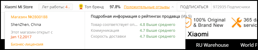Xiaomi Mi Store можно охарактеризовать как продавца с повышенной надежностью. Магазин работает уже более 4 лет. Продавец получил от администрации сайта титул «Топ-бренд». По всем параметрам («Соответствие товара описанию», «Коммуникация», «Скорость доставки») площадка получила оценки «Выше среднего» (показатели находятся в «зеленой зоне»).