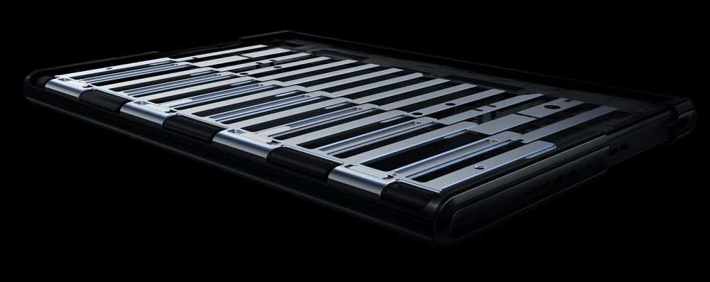 Сам же экран закреплен на подушке в форме гребешка. В сложенном виде поддерживается вся поверхность, в разложенном — жесткость дополнительно обеспечивают усиливающие элементы дисплея.