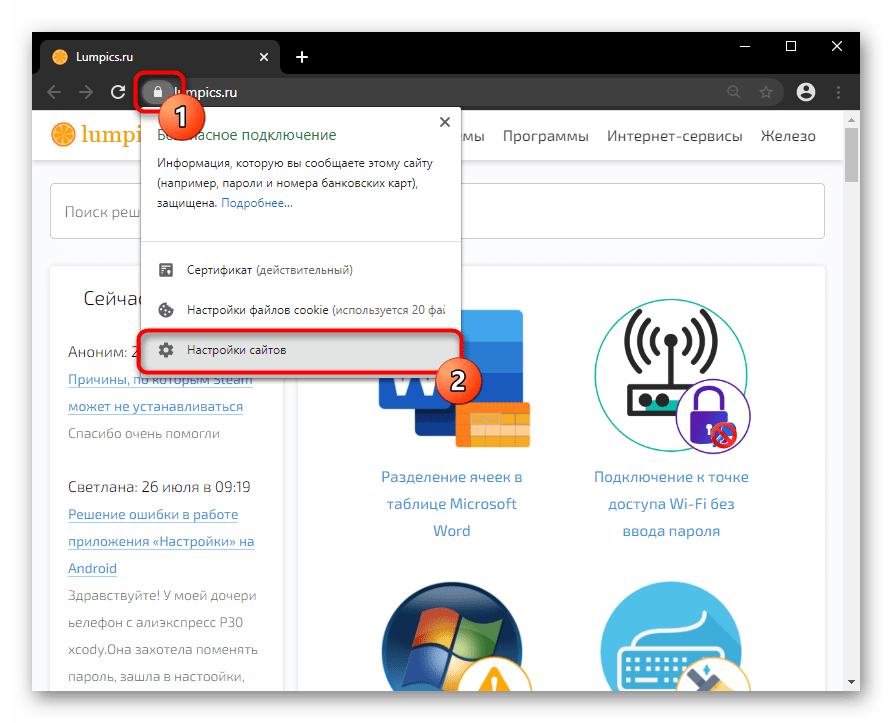 - Чтобы включить вебку заранее, можно открыть окно изменения разрешений, кликнув по иконке в адресной строке левее самого URL. В нем перейдите в «Настройки сайтов».