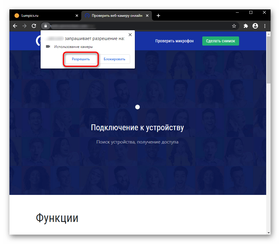 При каждом открытии страницы какого-либо сайта, подразумевающей работу веб-камеры (или исключительно при вызове функции на этой странице, для которой должна быть задействована вебка), браузер должен отобразить соответствующее уведомление под адресной строкой. Юзеру остается только нажать на «Разрешить».