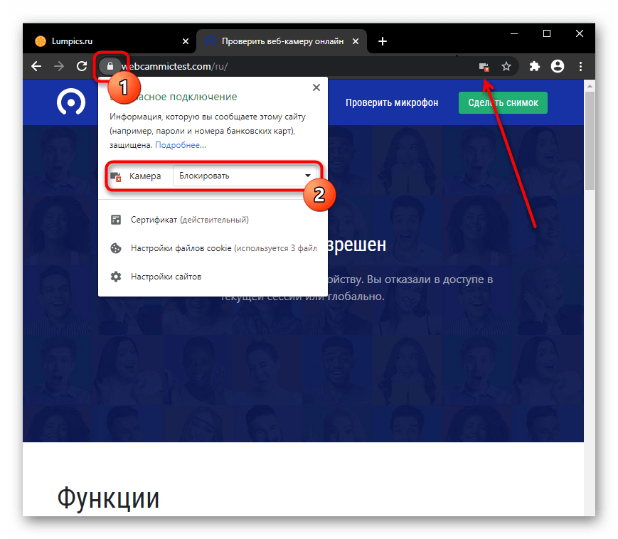 - Запретить. Блокируется доступ сайта к камере и микрофону. Если запретить доступ, некоторые сайты могут не работать. Например, вы не сможете присоединиться к видеоконференции.