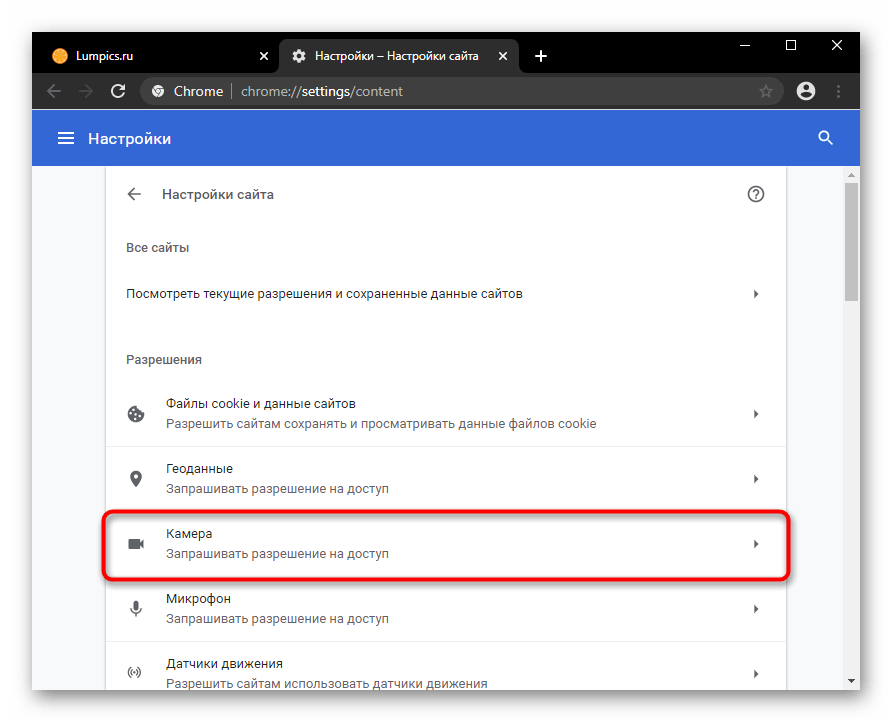 Найдите тут блок «Разрешения», а в нем пункт «Камера». Измените значение на «Разрешить». Будьте внимательны: изменение происходит только для текущего адреса, а не для всех.