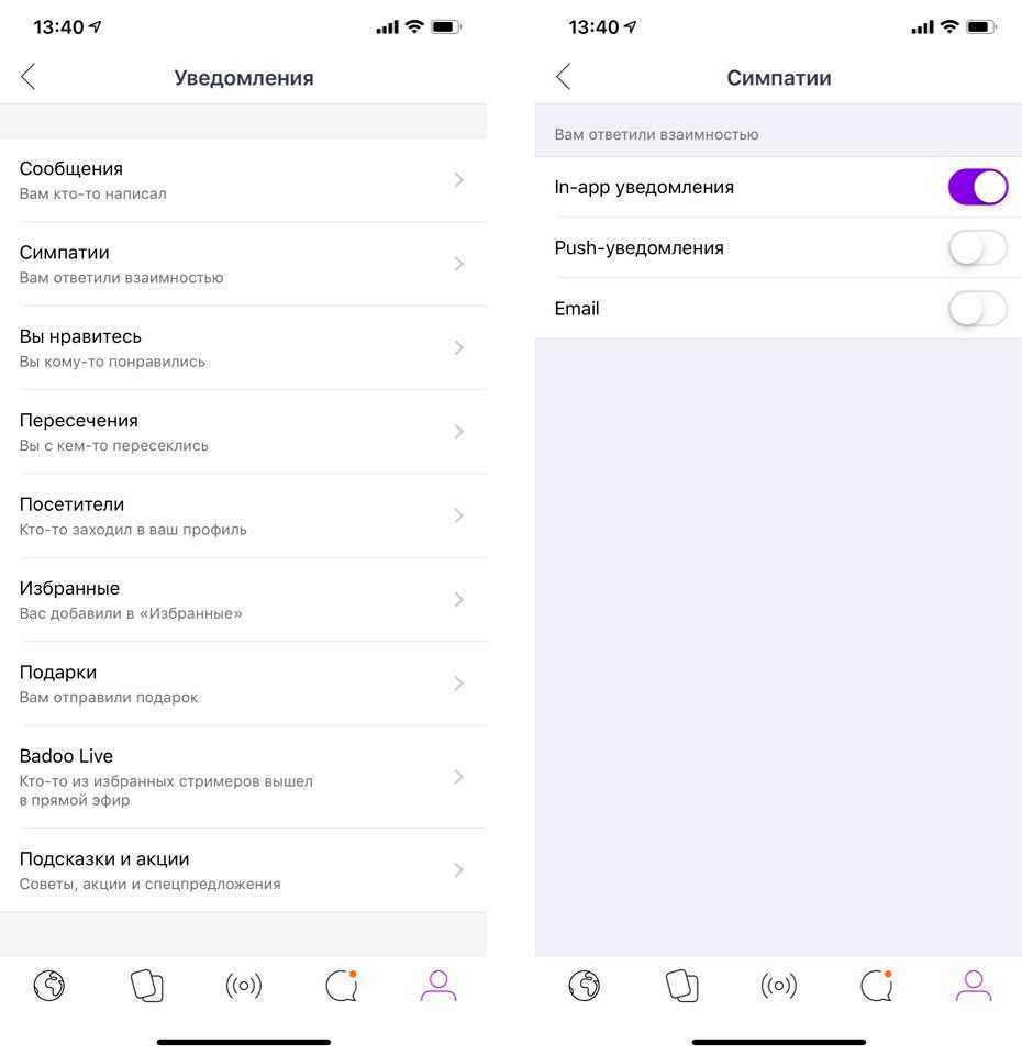 После этого зайдите в само приложение и выключите уже в его настройках ненужные уведомления, вот как это выглядит на примере Badoo: