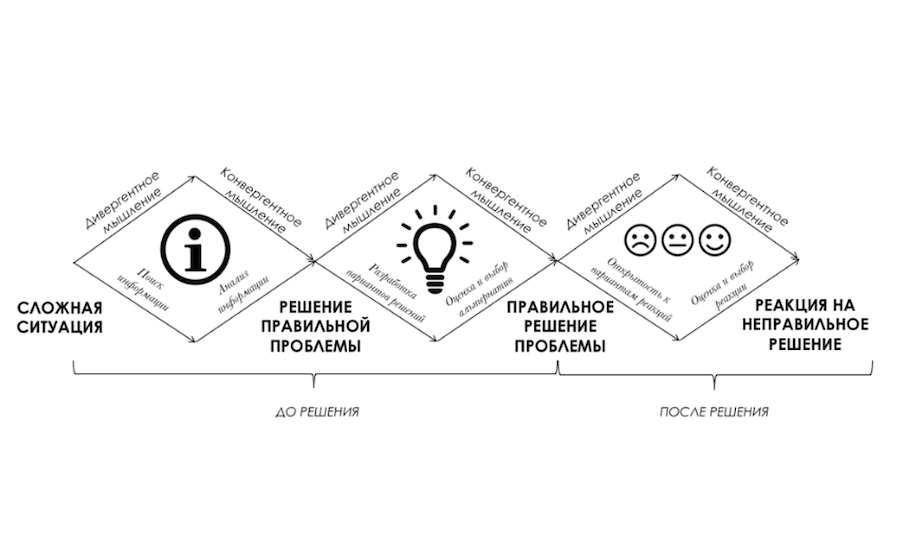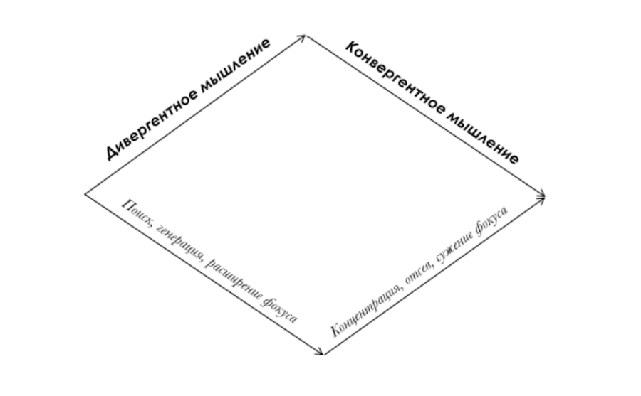 Визуально концепция чередования «режимов мышления» Гилфорда может быть изображена как ромб. Она наглядно показывает, как эффективно решать проблемы