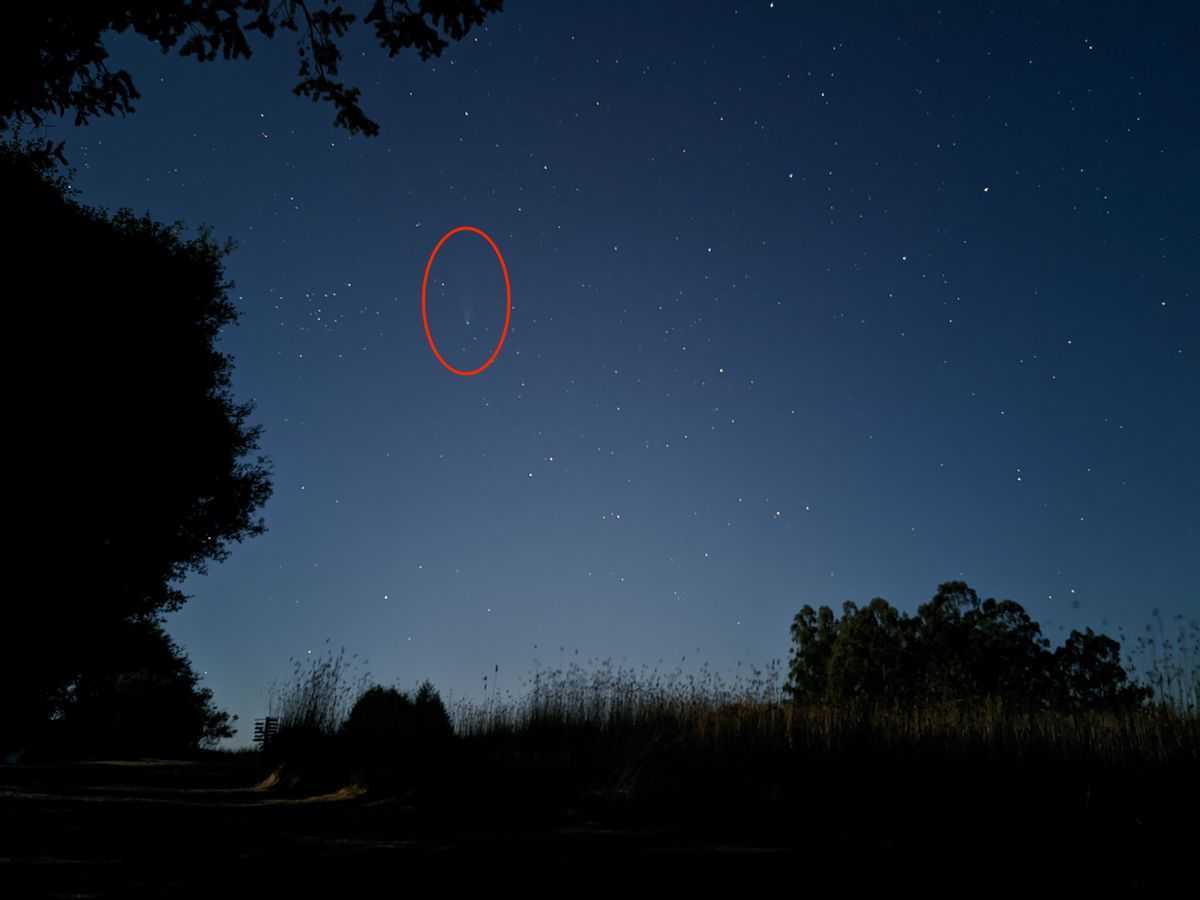 Pixel 4A astrophotography mode. (Click to enlarge. Circle added to show comet.)