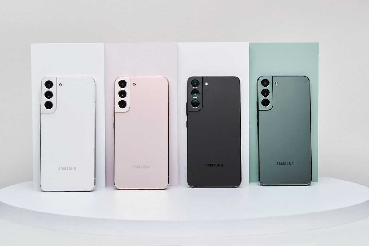 Основная цветовая палитра смартфонов Samsung Galaxy S22/22+ такая: «Белый фантом», «Зеленый», «Розовый», «Черный фантом». Также впервые Samsung представил эксклюзивные расцветки, которые можно приобрести только при заказе онлайн с официального сайта производителя: голубой, графитовый, бежевый и фиолетовый цвета.
