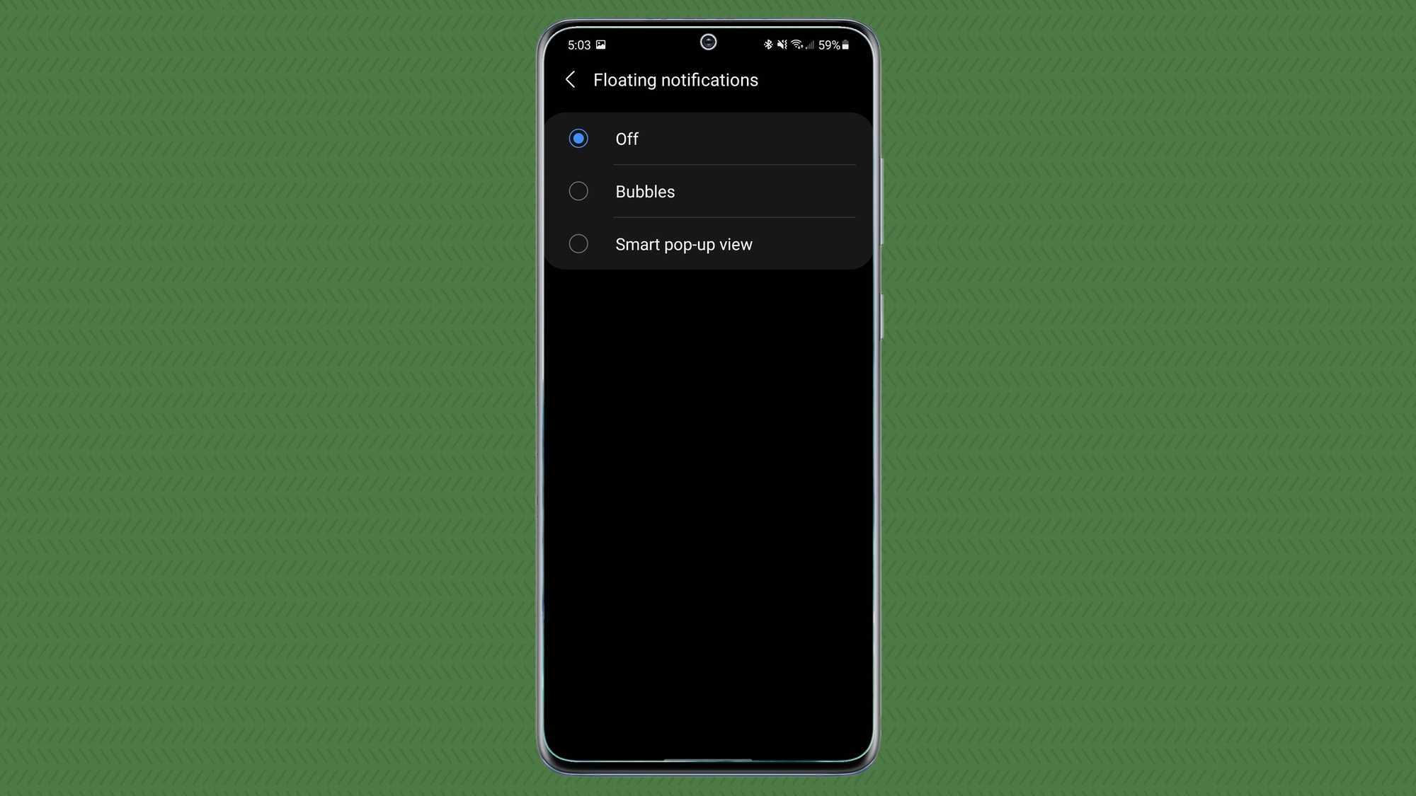 - Выберите плавающие уведомления, где вы можете выбрать между пузырьками и интеллектуальным всплывающим окном или полностью отключить их.