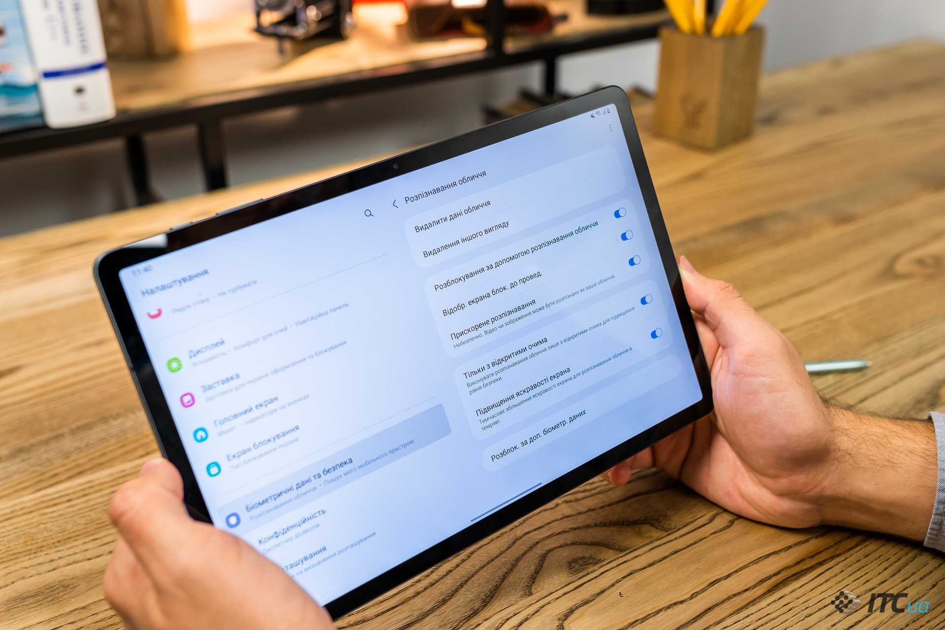 Приставка FE в названии планшета означает Fan Edition, она означает, что модель относится к флагманской линейке, но имеет ряд упрощений. И одним из них стал отказ от сканера отпечатков пальцев, вместо него используется система распознавания лица на основе встроенной фронтальной камеры. Она неплохо справляется с этой задачей, даже когда пользователь носит очки для зрения, но только если держать планшет горизонтально, что не всегда получается, например, когда носишь устройство чехле-книжке.