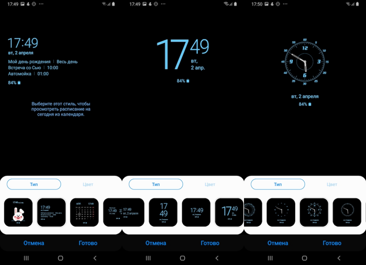 Это раз. Второй момент — это практичный режим Always On, когда в режиме ожидания видно разнообразные данные. Он компенсирует отсутствие светового индикатора для уведомлений. Причём можно настроить экран и выбрать из нескольких стилей оформления. Так что на выбор не просто один вариант с виджетами, а разнообразная подборка под настроение.