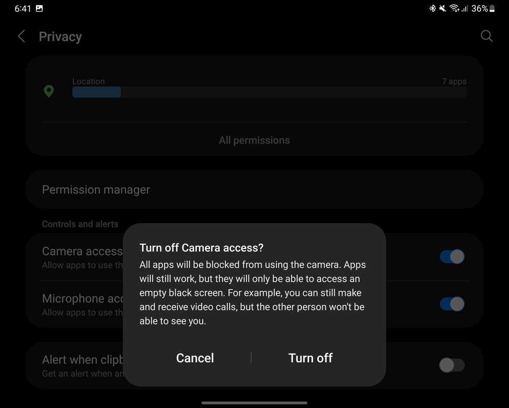 Здесь присутствуют новые переключатели и индикаторы строки состояния, которые помогут вам лучше понять, когда и какие приложения получают доступ к вашей камере или микрофону на устройстве. Вы увидите зеленый значок или точку в верхней правой части дисплея Galaxy, означающий, что открытое вами приложение получило доступ к микрофону или камере. Развернув быстрые настройки уведомлений и коснувшись значка, вы также увидите, какое приложение недавно обращалось к камере или микрофону.