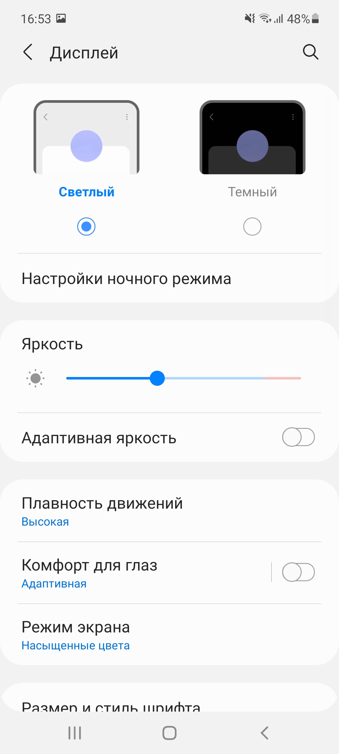 Экран действительно радует глаз и с ним приятно взаимодействовать на протяжении длительного времени. В настройках традиционно можно изменить режим цветопередачи (насыщенные или естественные цвета с регулировкой баланса белого), размер и стиль шрифта, масштаб экрана, включить повышенную или стандартную частоту обновления, режим комфорта для глаз или адаптивную яркость, выбрать темную тему, а также настроить панель Edge и AoD.