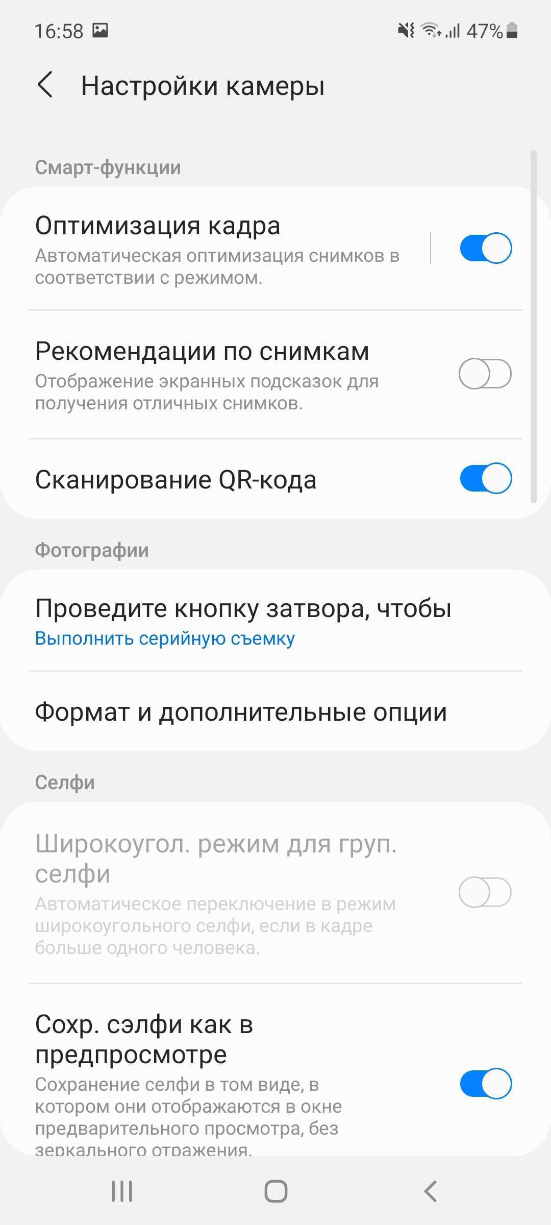 Фронтальная камера на 32 Мп со светосилой f/2.2. Здесь все точно также, как и в А52, и в прошлогоднем А71. Если говорить о видео, то снимать можно даже в UHD при тех же 30 fps. Как обычно, здесь предусмотрен режим одиночного и группового селфи, есть некоторый набор для изменения внешности, а также всевозможные фильтры.