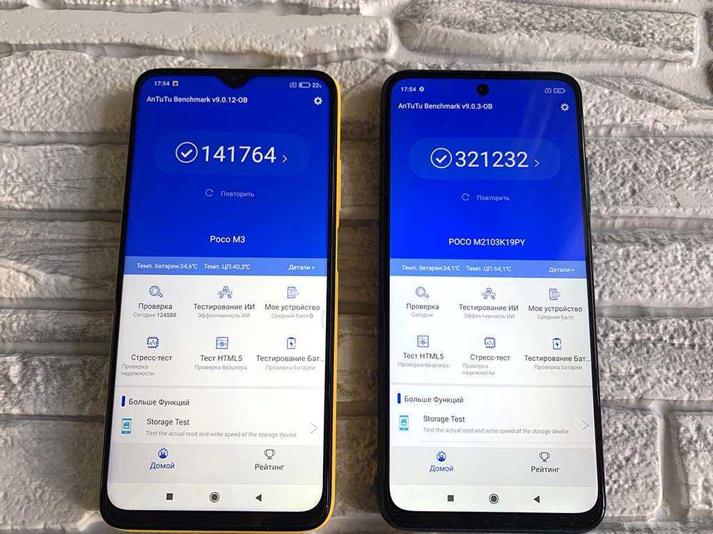 Если посмотреть на результаты тестирования AnTuTu, то Poco M3 набрал 141 764 балла, а Poco M3 Pro набрал 321 232 балла. Что ж, тут все наглядно видно, Pro-версия будет побыстрее.
