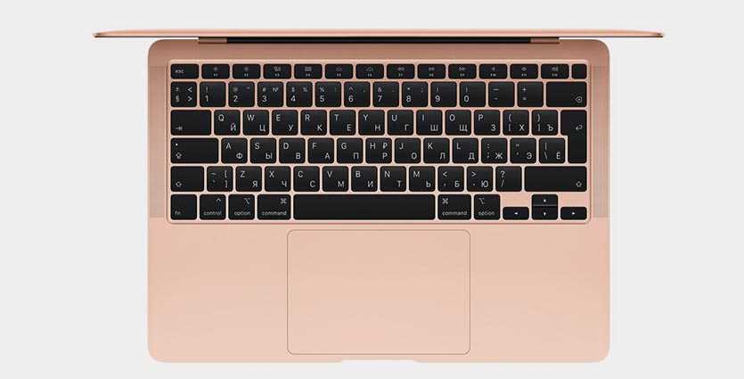 MacBook Air: оснащается ножничной клавиатурой на 78 или 79 клавиш (в зависимости от региона). Есть ряд физических функциональных кнопок, справа от которых расположился сканер Touch ID.