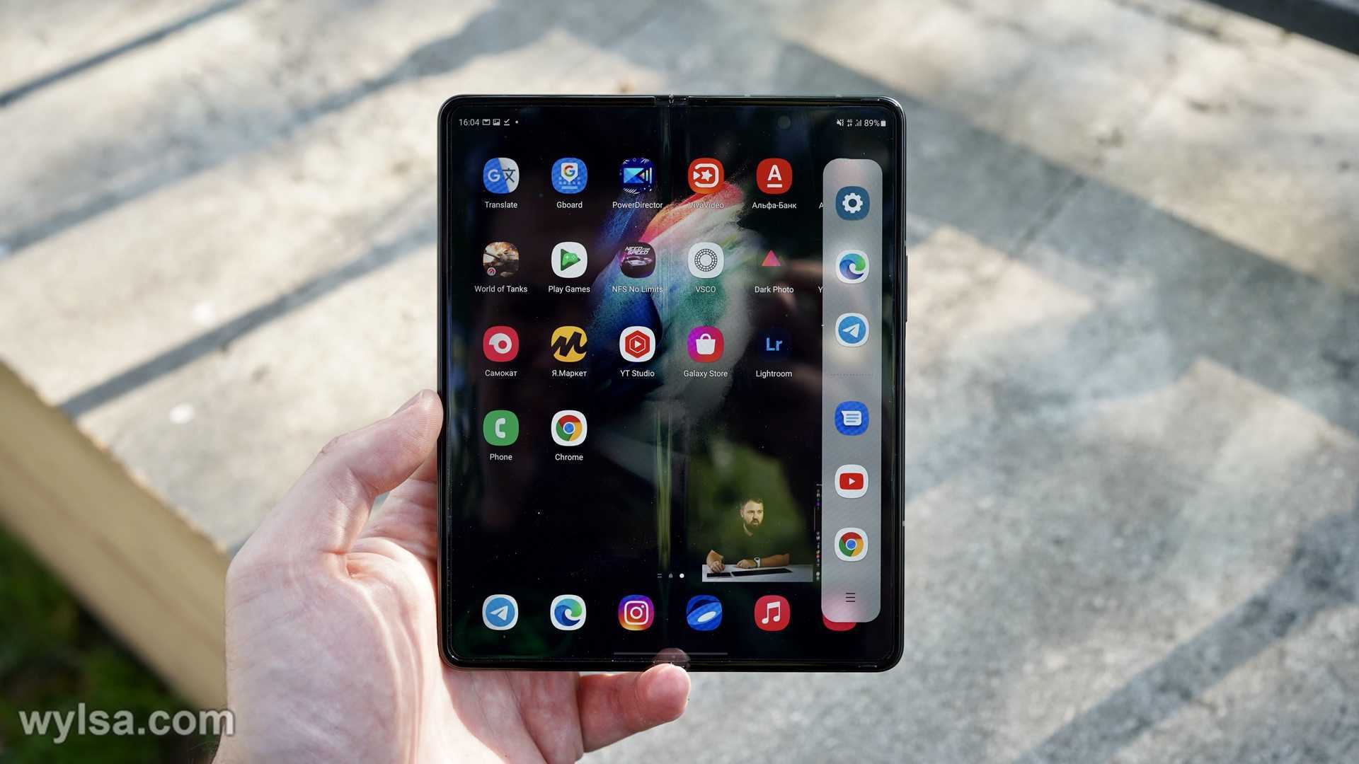 Изгиб посередине по-прежнему ощущается при касании, хотя во время просмотра контента практически незаметен. При этом сам шарнир немного изменился – теперь смартфон сохраняет любой угол наклона, который вам необходим. Galaxy Z Fold3 5G можно превратить в настоящий мини-планшет.