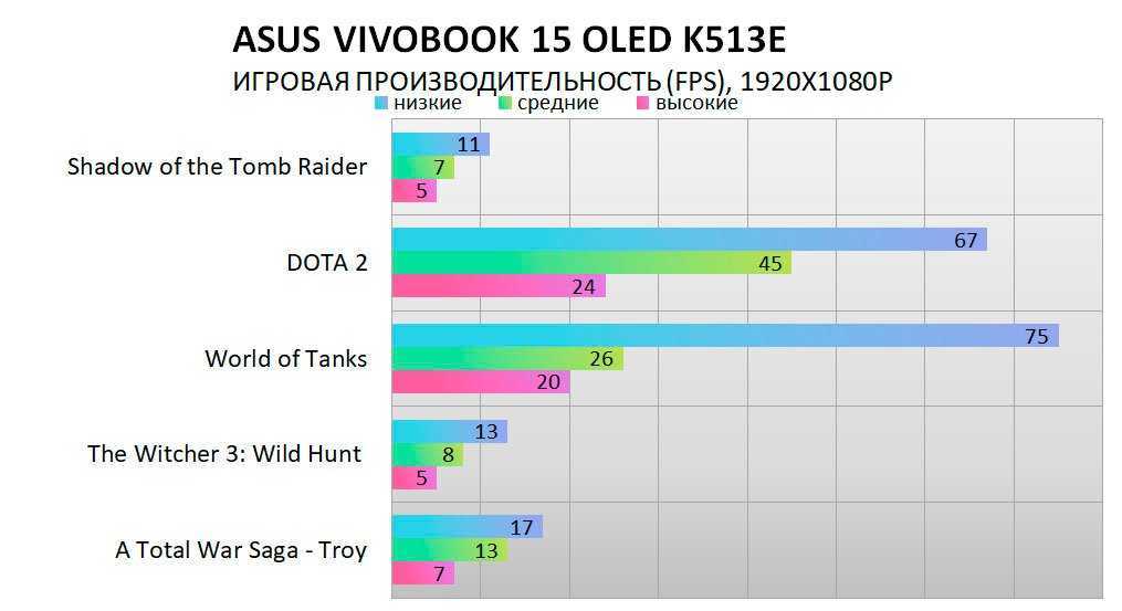 Игровая производительность никак не может быть сильной стороной ноутбука с видеоядром Iris Xe G7. Однако даже для такого бюджетного решения возможность поиграть остаётся – на разрешении FHD 1920х1080 вполне комфортные FPS показали World of Tanks и DOTA 2 на средне-низких настройках графики. Это значит, что ряд нетребовательных современных игр и более старой классики игрового мира будет ноутбуку вполне по зубам. Также остаётся возможность снизить разрешение до 1336х768, если другим способом добиться приемлемого FPS не удалось.