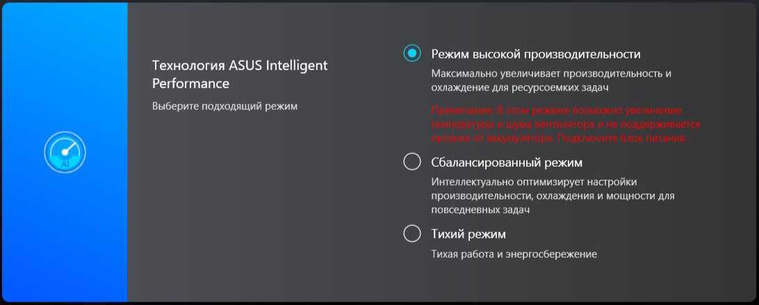 ASUS VivoBook 15 OLED K513E может работать в нескольких режимах системы, управление которым осуществляется при помощи фирменной утилиты MyASUS. Режимы подразумевают разную мощность работы системы охлаждения и таким образом регулируют производительность и шум работы. Проводить тесты будем в самом производительном режиме, а уровень шума сравним.